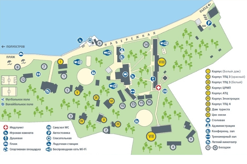 | Корпус № 1. Двухэтажный корпус - первая линия от воды с балконами на реку. На каждом этаже расположен санузел, душевая, кухня. Комплектация номера: кровати, прикроватные тумбочки, шкаф, холодильник. |